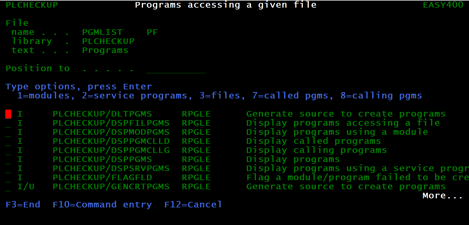 Press F12 to go back to Figure 5. Now use option 7 (Called programs) to display the list of programs called from program PLCHECKUP: